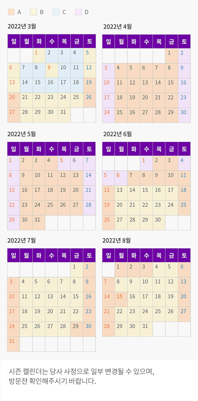 그래서 아래 사진에서 방문하고 싶은 날짜가 어느 시즌에 해당하는지 확인해주세요.