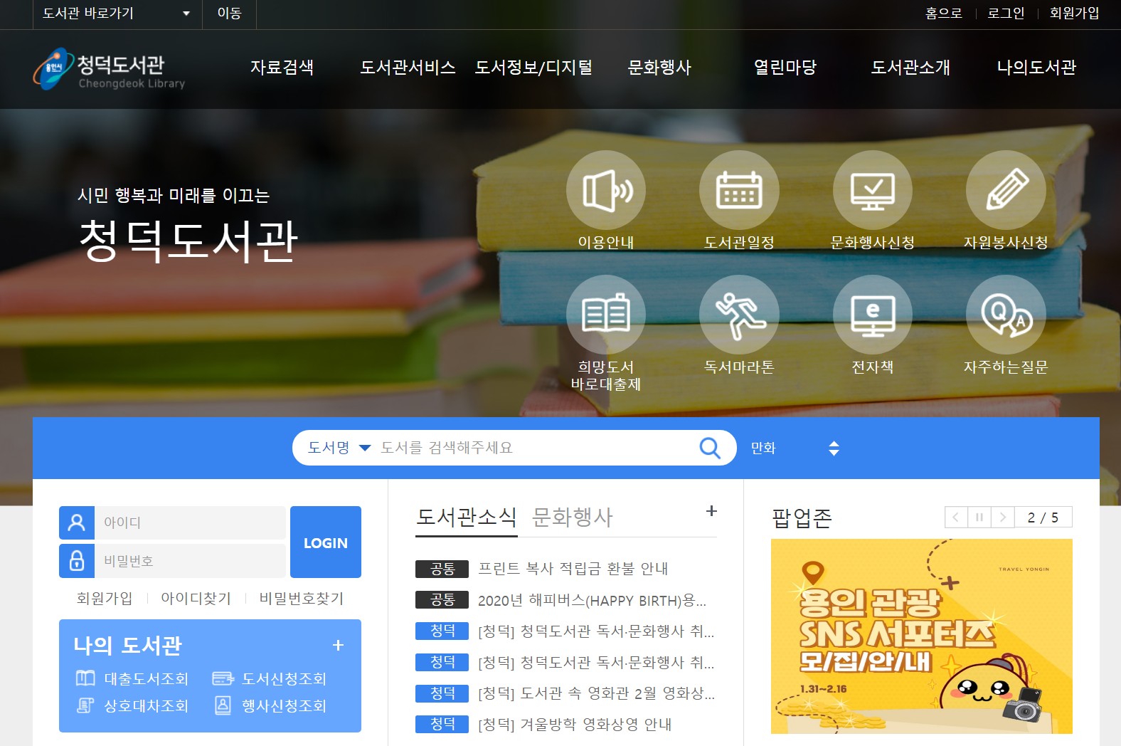 용인시 도서관 중 청덕도서관 홈페이지로 들어갔습니다.