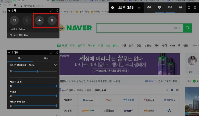 그중에 빨간 박스표시 부분을 보면 녹화버튼과 마이크버튼이 있습니다.