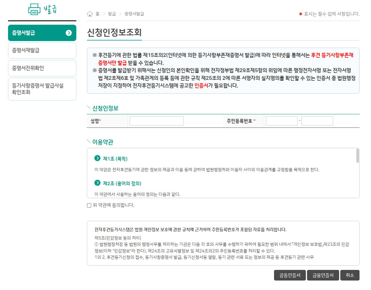 3. 신청인정보조회에서 성명, 주민등록번호, 약관동의 체크 후 공동인증서 or 공용인증서를 선택한다.