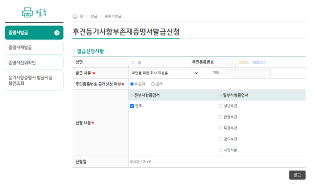 4. 성명, 주민등록번호, 발급사유, 주민등록번호 공개신청여부, 신청내용 을 체크한후 발급을 누른다.