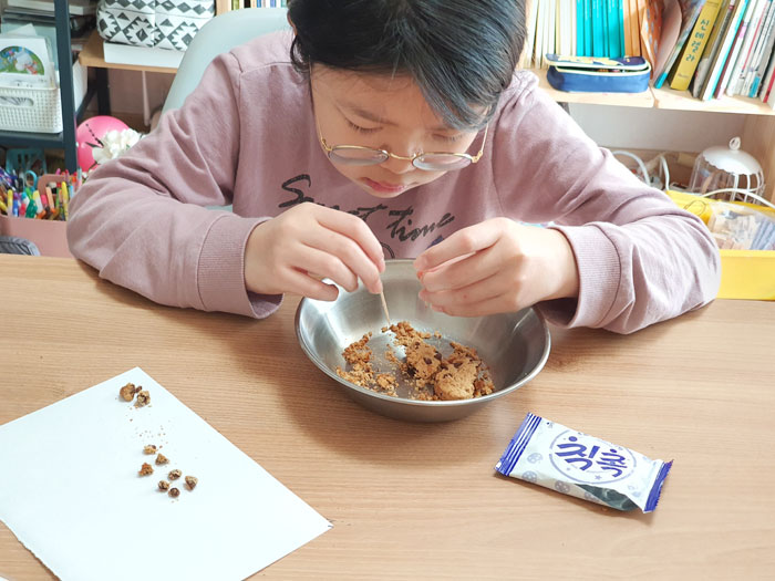 직접 화석을 발굴하면 좋겠지만 현실적으로 불가능하니 그나마 구하기 쉬운 초코칩과자에서 초코를 발굴하는 걸로 대신하였습니다.